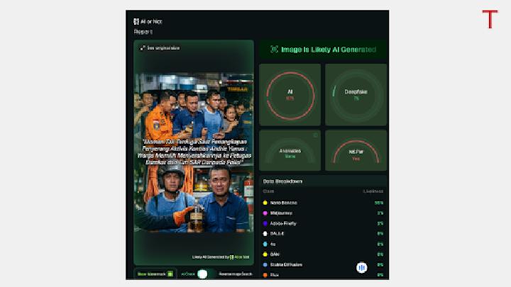 Hasil pemeriksaan menggunakan alat pelacak Hive Moderation makin memperkuat temuan tersebut. Alat ini mencatat skor probabilitas 95,8 persen bahwa foto tersebut adalah buatan akal imitasi. Peranti AI or Not pun memberikan kesimpulan serupa dengan tingkat keyakinan 97 persen. Alat ini mendeteksi konten tersebut kemungkinan besar diproduksi menggunakan model akal imitasi Nano Banana milik Google.