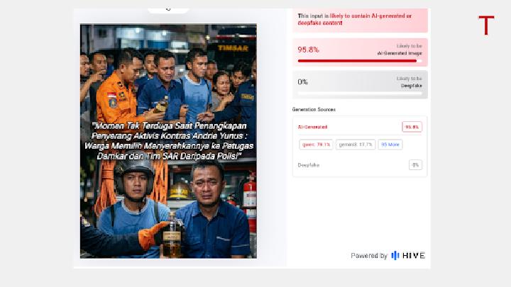 Unggahan ini menyebutkan bahwa warga memilih menyerahkan para pelaku kepada petugas damkar dan SAR alih-alih polisi. Namun, kenyataannya berbeda. Tempo melakukan verifikasi terhadap konten tersebut melalui pencarian gambar terbalik, alat deteksi akal imitasi (AI), serta membandingkannya dengan pemberitaan dari media kredibel. Hasilnya menunjukkan bahwa foto tersebut adalah hasil karya satir yang dibuat menggunakan teknologi AI.
