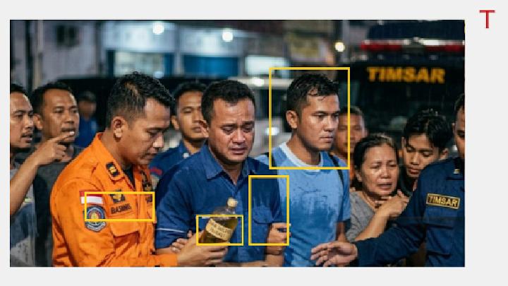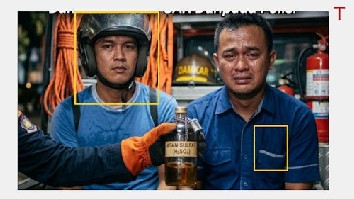 Salah satu cara untuk mengidentifikasi konten buatan AI adalah melalui analisis visual manual. Dalam proses ini, Tempo menemukan beberapa kejanggalan yang sering muncul pada gambar hasil olahan mesin. Misalnya, tulisan pada lencana seragam petugas dan label botol dalam foto pertama tidak terbaca meski gambar sudah diperbesar. Selain itu, ada perbedaan mencolok antara foto pertama dan kedua. Pria dalam foto pertama tidak mengenakan helm, namun tiba-tiba memakainya di foto kedua. Corak kemeja biru yang dipakai pria lainnya juga tampak berbeda.